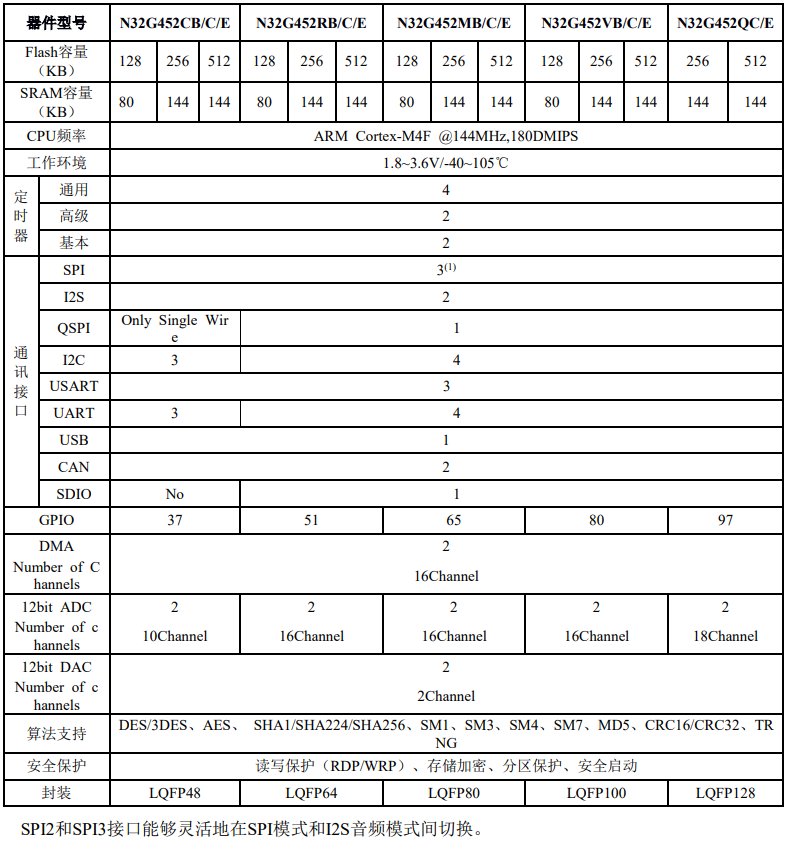 N32G452系列采用32bit ARM Cortex-M4内核,最高工作主频144MHz,支持浮点运算和DSP指令,集成高达512KB嵌入式FIash,144KB SRAM,多个U(S)ART、I2C、SPI、QSPI、USB.CAN通信总线接口,集成12bit ADC、DAC等模拟接口,内置密码算法硬件加速引擎。