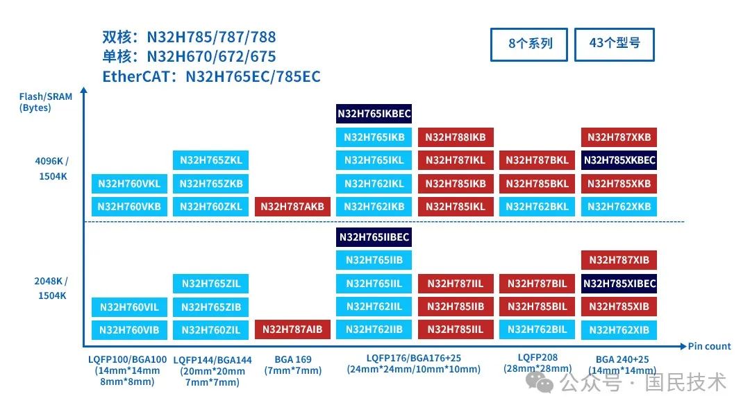 N32H788首批提供有1种封装1个产品型号,N32H787、N32H785系列首批各提供有4种封装8个产品型号,N32H785EC系列首批提供有1种封装2个产品型号,N32H765、N32H762系列首批各提供有4种封装8个产品型号,N32H765EC系列首批提供有1种封装2个产品型号,N32H760系列首批提供有3种封装6个产品子型号。