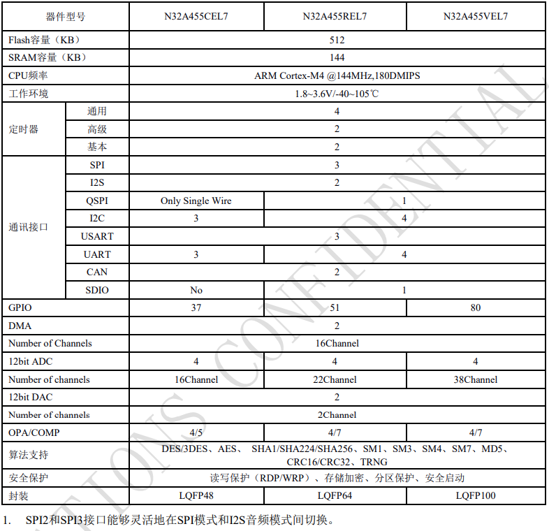 N32A455系列采用32bit ARM Cortex-M4内核,最高工作主频144MHz,支持浮点运算和DSP指令,集成高达512KB嵌入式Flash,144KB SRAM,集成丰富的高性能模拟器件,内置4个12bit 5MspS ADC,4路独立轨到轨运算放大器,7个高速比较器,2个1Msps 12bit DAC,集成多路U(S)ART、I2C、SPI、QSPI、CAN、SDIO通信接口,内置密码算法硬件加速引擎。